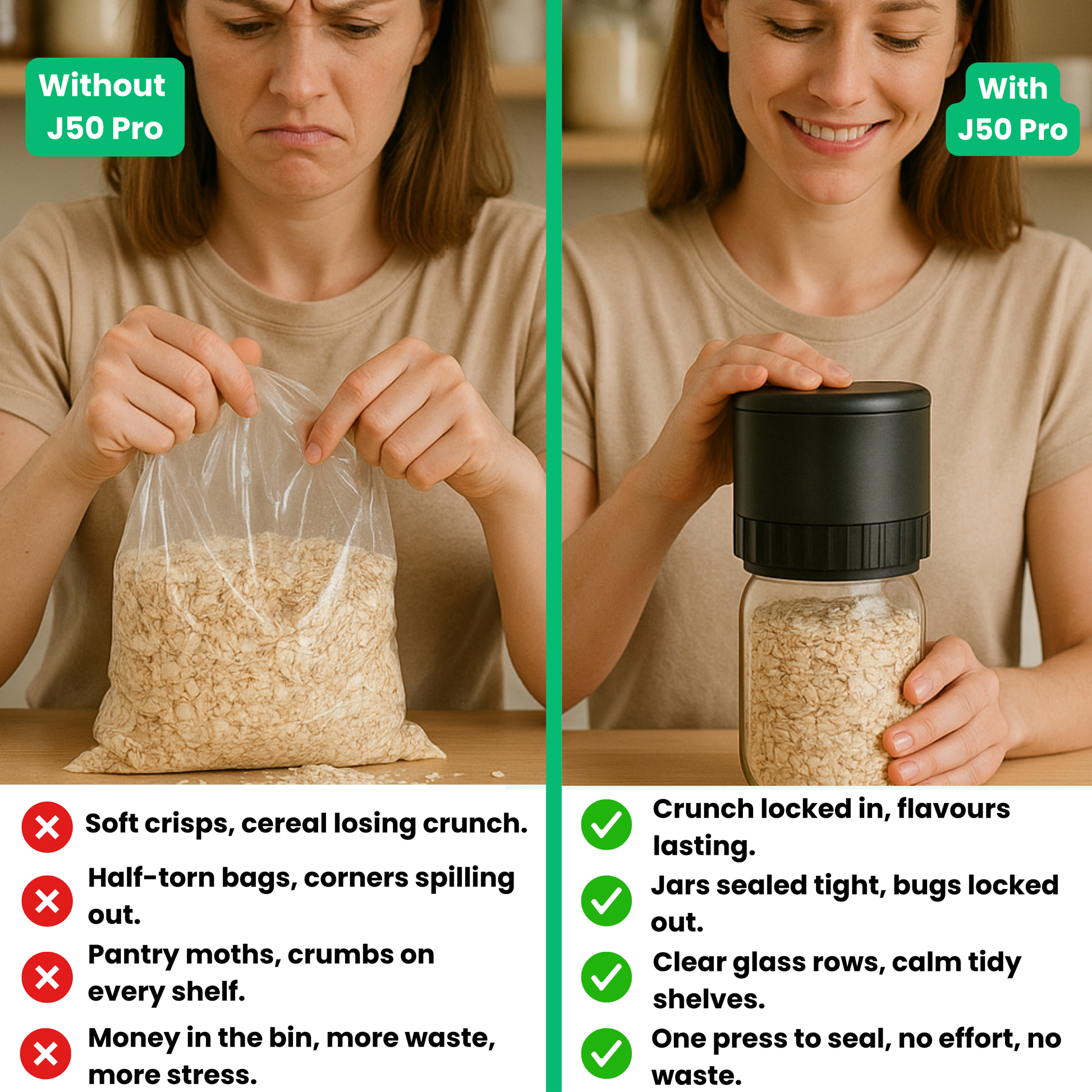“I thought clips and ‘airtight’ tubs were enough until I tried the J50 PRO. Now my snacks stay crunchy for months, and my flour is finally safe from moths. I honestly feel like I’ve stopped throwing money in the bin.”Claire, 41