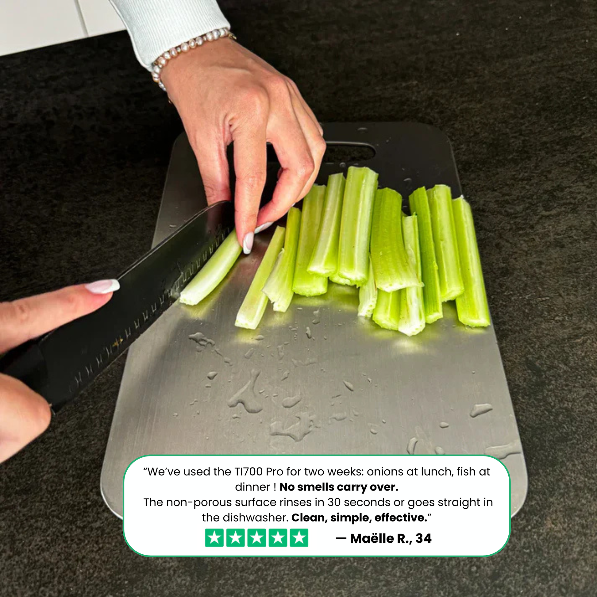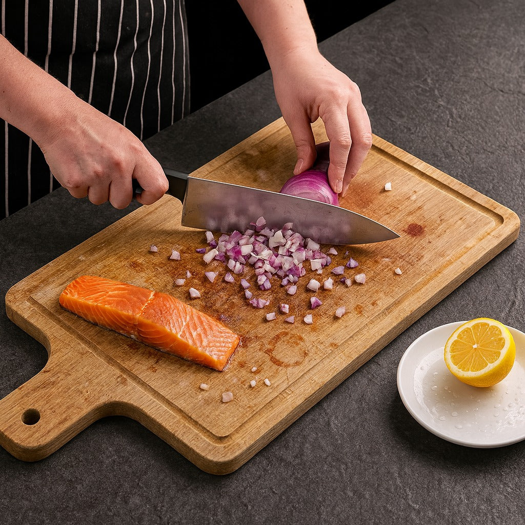 ✨ “Chopped onions and fish back-to-back no smell, no slip, and my knife still slices paper. Rinse, dishwasher, done.” - Neya, 34