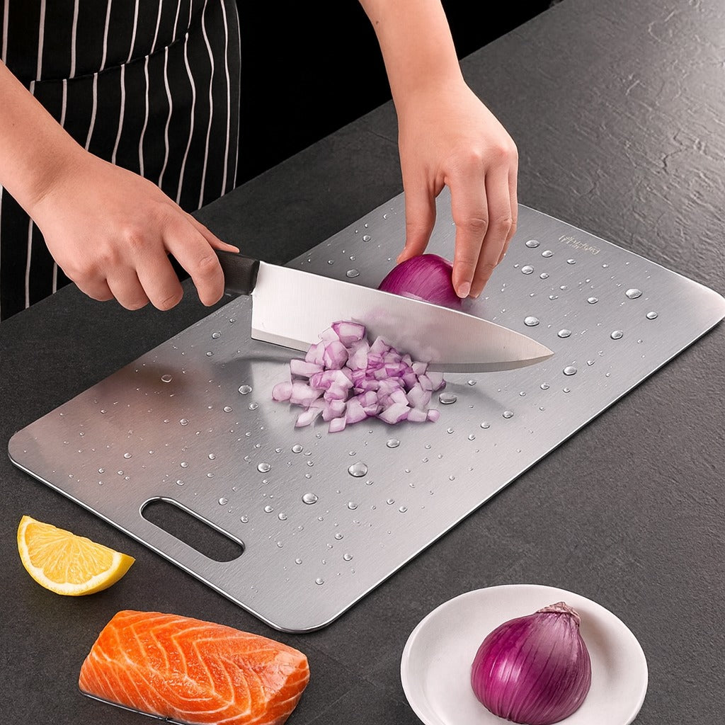 I was sceptical about metal and knife wear. After two weeks of daily prep, my chef’s knife still slices paper cleanly. The EdgeKind™ surface feels different in a good way, controlled cuts, no chattering.